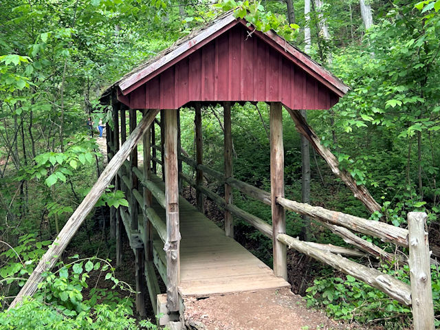 | (Gillette Castle State Park, 42', 1974, 07-04-q) across a ravine in Gillette Castle State Park S. of East Haddam, East Haddam Township, Middlesex County, CT. CT82 (Town St.) S. 1.2 miles from jct with CT434 NE of East Haddam, W. (curves S.) on CT431 (River Rd.) 1.6 miles, W. (curves S.) on park road 0.5 miles to park bldgs. Bridge on hiking trail. (N41 25.409 W72 25.777) Photo by Amanda Finkelstein 5-26-25. |