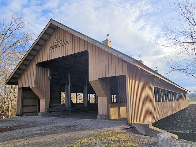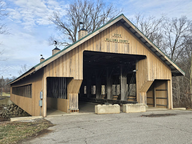 | (Montpelier Fairgrounds, 130', 2004, 35-86-26) across St. Joseph River at the fairgrounds in Montpelier, Superior Township, Williams County, OH. OH107 (E Main St.) E. 0.5 miles from jct with OH576 (Platt St.) in Montpelier, N. into the fairgrounds. Bridge is at the N. end of the fairgrounds. (N41 35.461 W84 35.947) Top 3 photos by Mark Comstock & Nevaeh Forrest 12-22-25. |