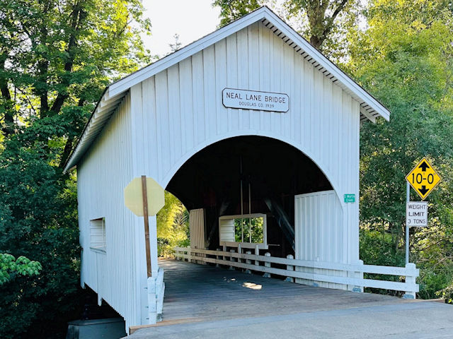 | (Neal Lane, 42', 1929, closed, 37-10-07) across South Myrtle Creek SE of Myrtle Creek, Douglas County, OR. Main St. E. (curves S.) 0.6 miles from jct with I5 exit 108, E. on Riverside Dr. 0.15 miles, SE on Days Creek Cutoff Rd. to the bridge on the NE side of the road. (N43 01.020 W123 16.471) Top 3 photos by Paul Chandler 6-23-25. |