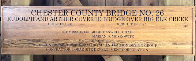 | (Rudolph & Arthur, 99', 1886, Rebuilt 2025, 38-15-01) across Big Elk Creek N. of Lewisville, Elk/New London Township, Chester County, PA. PA841 N. (curves NE) 1.5 miles from jct with PA472 in Lewisville, N. on Lewisville Rd. 0.3 miles, W. on Camp Bonsul Rd. 0.5 miles to the bridge. (N39 44.749 W75 52.939) Top 4 photos by Glenn Allen Wilker 10-27-25. |