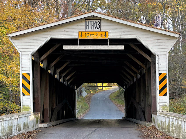 | (Glen Hope, 78', 1889, 38-15-02) across Little Elk Creek SSE of Hickory Hill, Elk Township, Chester County, PA. Hickory Hill Rd. SSE 1.7 miles from jct with PA472 in Hickory Hill to the bridge. (N39 43.617,W75 54.459) Top 2 photos by Glenn Allen Wilker 10-27-25. |
