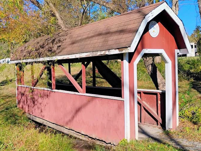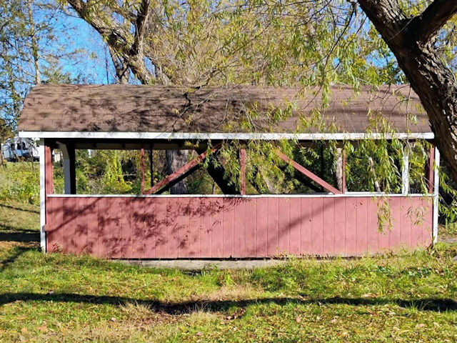 | (Thousand Trails, 24', 38-38-f) across a stream in Thousand Trails Campground S. of Annville, South Annville Township, Lebanon County, PA. PA934 (White Oak St.) S. 3.5 miles from jct with US422 in Annville, W. on US322 2.2 miles, S. on Mt. Pleasant Rd. 1.15 miles, veer right into the campground & the bridge is about 120 yds S. of the S. part of the lake. (approximate N40 15.943 W76 31.468) Photos by Glenn Allen Wilker 10-27-25. |