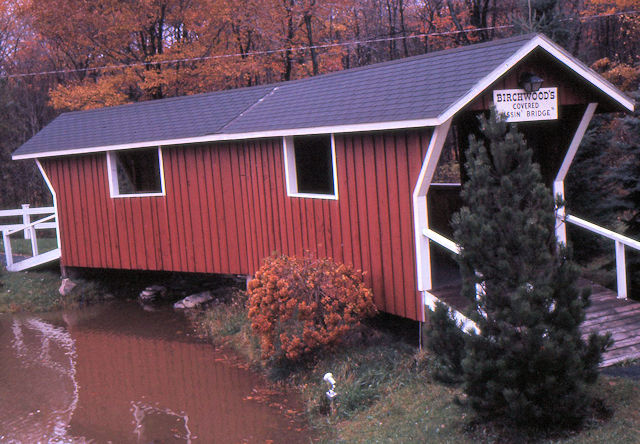 | (Birchwood, 38', c1960, 38-45-c) across Cranberry Creek in Birchwood Resort (closed), NE of Tannersville, Pocono Township, Monroe County, PA. PA715 N. 2.2 miles from jct with PA611 just NW of Tannersville, E. on Cherry Lane Church Rd. 1.1 miles, N. on Cherry Lane Rd. 0.5 miles, E. on Birchwood Rd. 0.7 miles to the resort on the S. side of the road. Birchwood resort is now closed, but you can still walk to the bridge. (N41 03.500 W75 15.019) Top 3 photos by June Schmidt 6-22-06. |