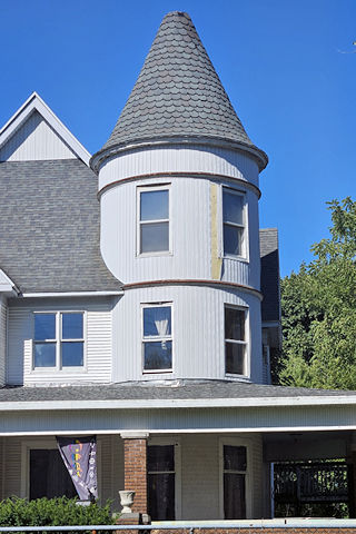 , Berrien County, MI. Colfax Av. S. 0.75 miles from jct with Main St. to the turret on the W. side of the road at 744. (N42 06.273 W86 27.387) Photo by Mark Comstock & Arthur Kramer 8-30-25.