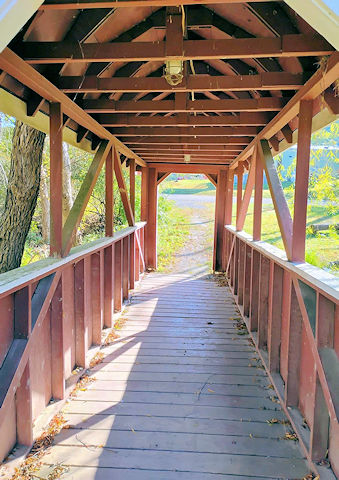 | (Thousand Trails, 24', 38-38-f) across a stream in Thousand Trails Campground S. of Annville, South Annville Township, Lebanon County, PA. PA934 (White Oak St.) S. 3.5 miles from jct with US422 in Annville, W. on US322 2.2 miles, S. on Mt. Pleasant Rd. 1.15 miles, veer right into the campground & the bridge is about 120 yds S. of the S. part of the lake. (approximate N40 15.943 W76 31.468) Photos by Glenn Allen Wilker 10-27-25. |
