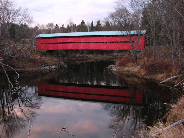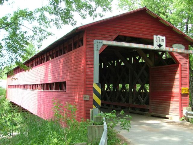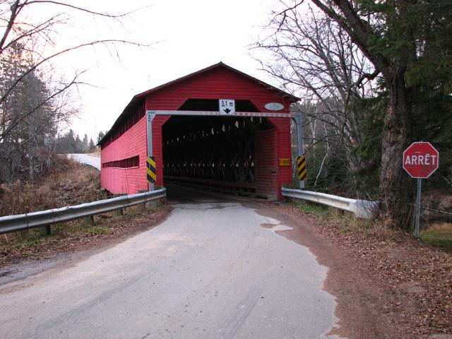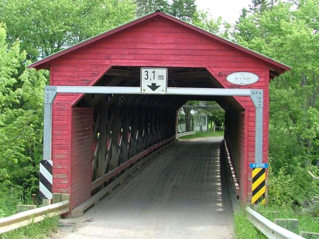 | (de lAigle, 128' (39m), 1925, 61-25-11) across Desert River NNW Maniwaki, Egan-Sud Township, Gatineau County, QC. Ch du Parc Industriel W. 0.6 miles (1.0km) from jct with PH105 on the N. side of Maniwaki, continue W. (curves N.) on Ch de Montcert 5.2 miles (8.4km), W. on Ch de L'Aigle 1.0 miles (1.6km) to the bridge. (N46 27.174 W76 02.664) Top 3 photos by Jack & June Schmidt 6-11-11. |