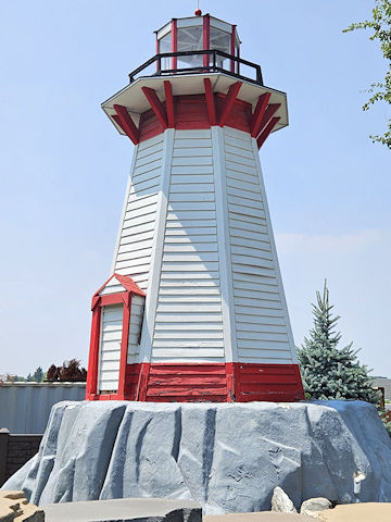 | (Lighthouse, MI-50-26) at CJ Barrymores Amusement Park N. of Mt. Clemens, Clinton Township, Macomb County, MI. Hall Rd. W. 2.35 miles from jct with I94 exit 240 NE of Mt. Clemens to the park on the S. side of the road. Lighthouse is in the SW corner of the park, admission. (N42 37.572 W82 53.793) Photo by Mark Comstock & Dionis & Nevaeh Forrest 7-15-25. |
