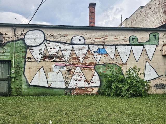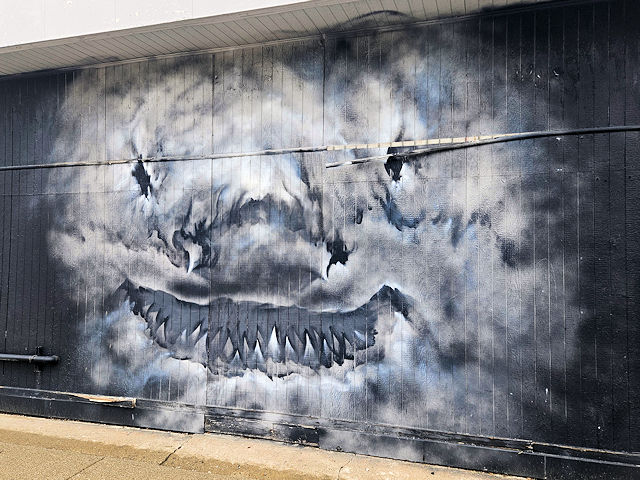 (Great White Shark Face) SE side Gratiot St. 210 NE of St. Aubin St. at 2158. (N42 20.992 W83 02.016) Photo by Mark Comstock [7-29-25] |