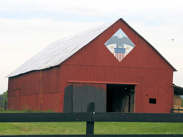 | (Eagle, KY-50-04) E. of Horse Cave, Hart County, KY. KY218 (Main St. - becomes Charlie Moran Hwy) E. 3.85 miles from jct with US31W in Horse Cave, S. on US31E 0.2 miles to the quilt on the W. side of the road at 7135. Sherman & Eleanor Vance. (N37 09.840 W85 50.481) Photos by Jack & June Schmidt 6-18-17. |