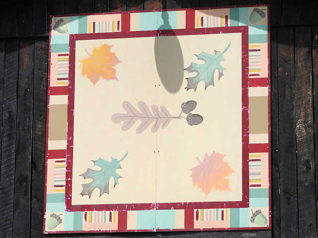 | (Amber Leaves, KY-50-14) NNE of Munfordville, Hart County, KY. I65 N. 6.3 miles from jct with US31W in Munfordville, E. on KY728 (Bacon Creek Rd.) 200, S. on Frenchman Knob Rd. 0.5 miles, E. on Locust Grove Rd. 2.45 miles, S. on James Ragland Rd. 0.1 miles to the quilt on the W. side of the road at 151. Lynn & Bettie Roberts. (N37 22.230 W85 50.990) Photos by Jack & June Schmidt 6-18-17. |
