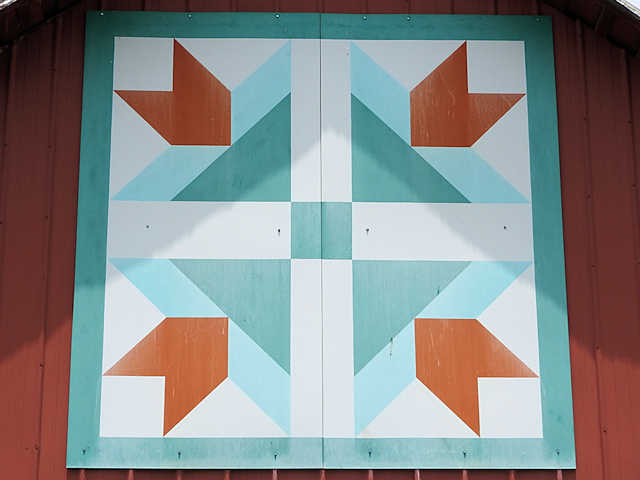 | (Goose Tracks, KY-50-18) E. of Munfordville, Hart County, KY. US31W SE (curves SW) 1.05 miles from jct with Union St. in Munfordsville, NE (curves E.) on KY88 (Hardyville Rd.) 2.0 miles to the quilt on the N. side of the road at 2050. Richard & Ann Wilkerson. (N37 16.308 W85 51.119) Photos by Jack & June Schmidt 6-18-17. |