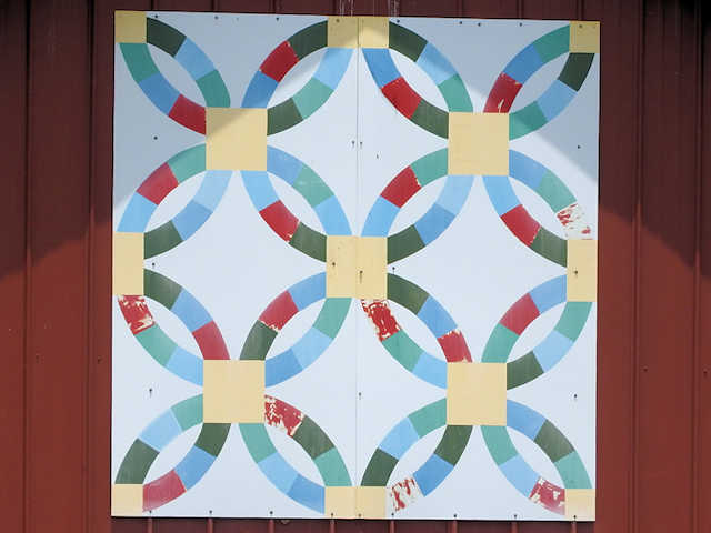 | (Double Wedding Ring, KY-50-19) E. of Munfordville, Hart County, KY. US31W SE (curves SW) 1.05 miles from jct with Union St. in Munfordsville, NE (curves E.) on KY88 (Hardyville Rd.) 3.25 miles, NE (curves E.) on KY1854 (Boyds Knob Rd.) 1.05 miles to the quilt on the N. side of the road at 1105. Bobby & Shirley Smith. (N37 16.982 W85 48.811) Photos by Jack & June Schmidt 6-18-17. |
