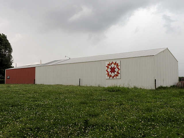 | (Carpenters Wheel, KY-50-22) SE of Munfordville, Hart County, KY. US31W SE (curves SW) 1.15 miles from jct with Union St. in Munfordsville, SE (curves S.) on KY571 (Lonoke Rd.) 2.05 miles, E. on Bunnell Crossing Rd. 4.3 miles to the quilt on the S. side of the road at 6489. CF & Martha Martin. (N37 13.352 W85 47.229) Photos by Jack & June Schmidt 6-18-17. |
