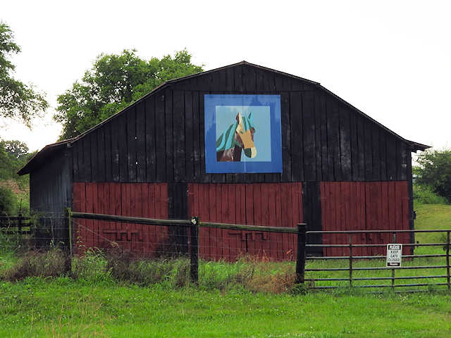 | (Horse, KY-50-27) E. of Horse Cave, Hart County, KY. KY218 (Main St. - becomes Charlie Moran Hwy) E. 3.85 miles from jct with US31W in Horse Cave, N. on US31E 0.55 miles to the quilt on the W. side of the road at 6425. Kevin & Deanna Vance. (N37 10.450 W85 50.162) Photos by Jack & June Schmidt 6-18-17. |