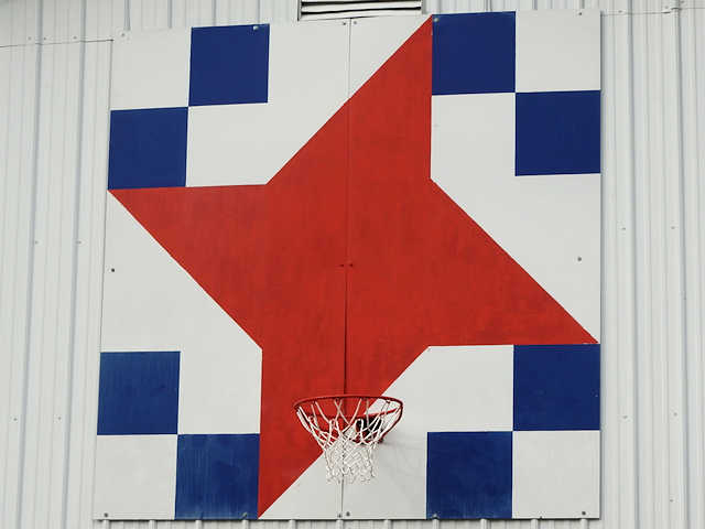 | (Texas Star, KY-50-28) NW of Cave City, Hart County, KY. Grinstead Mill (becomes Toohey Ridge) Rd. NE (curves NW) 2.9 miles from jct with KY70 (Mammoth Cave St.) in Cave City to the quilt on the NE side of the road at 1470. Vada & George Maulden. (N37 10.189 W85 59.232) Photos by Jack & June Schmidt 6-18-17. |