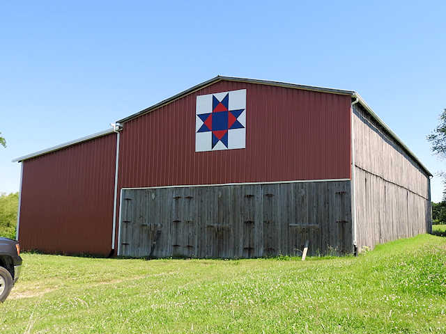 | (Ohio Star, KY-50-34) W. of Munfordville, Hart County, KY. KY88 (West St. - becomes Cub Run Hwy) W. 12.6 miles from jct with Union St. in Munfordville, S. on KY728 (Gap Hill Rd.) 0.6 miles, W. on KY728 (Gap Hill Rd.) 1.0 miles to the quilt on the N. side of the road at 1524. Joyce & Ron Gonterman. (N37 17.599 W86 04.651) Photos by Jack & June Schmidt 6-20-17. |