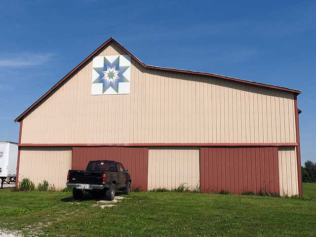 | (Lemon Twist, KY-50-48) SSW of Munfordville, Hart County, KY. US31W S. 2.4 miles from jct with KY357 (Union St.) in Munfordville, SW on KY335 (L&N Turnpike Rd.) 1.7 miles to the quilt on the NE side of the road at 1880. Linda Puckett. (N37 13.761 W85 55.028) Photos by Jack & June Schmidt 6-21-17. |