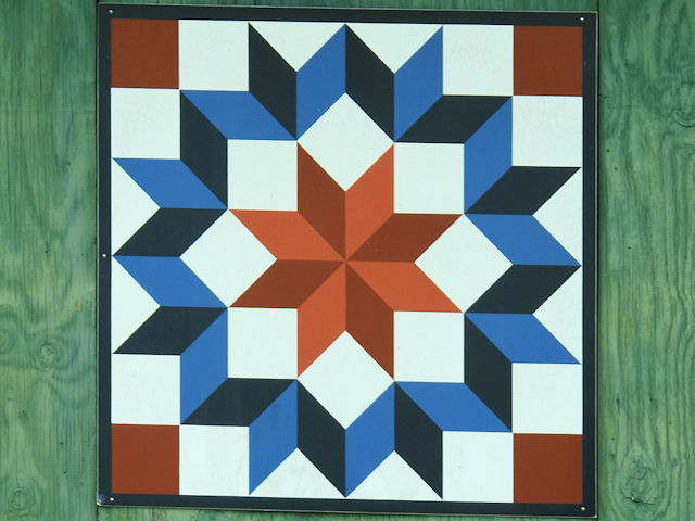 | (Carpenters Star, MO-36-08) S. of Berger, Boeuf Township, Franklin County, MO. SR B S. 1.3 miles from jct with Berger Rd. in Berger to the quilt on the W. side of the road at 3851. Long Eared Acres. (N38 39.523 W91 20.713) Photos by Jack & June Schmidt 8-1-24. |