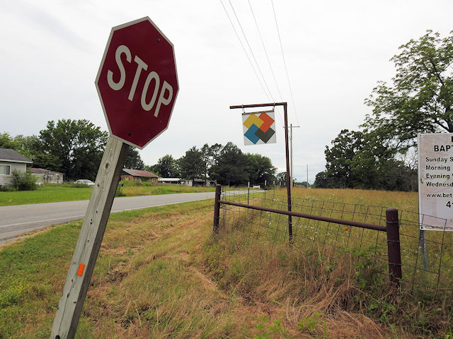 | (Card Trick, MO-49-28) E. of Carthage, Madison Township, Jasper County, MO. Fairview Av. (becomes Gum Rd.) E. 6.2 miles from jct with I45 exit 50 just S. of Carthage to the quilt on the N. side of the road just before CR90. Mary Riley. (N37 09.234 W94 13.155) Photos by Jack & June Schmidt 6-12-25. |