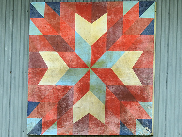 | (Untitled, MO-49-33) NW of Carthage, Marion Township, Jasper County, MO. Civil War Av. N. 1.55 miles from jct with I45 exit 55 NW of Carthage, W. on Locust Rd. 2.9 miles to the quilt on the S. side of the road at 17846. Diane Jones. (N37 13.628 W94 22.738) Photos by Jack & June Schmidt 6-13-25. |