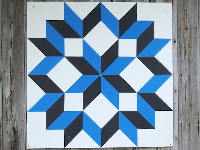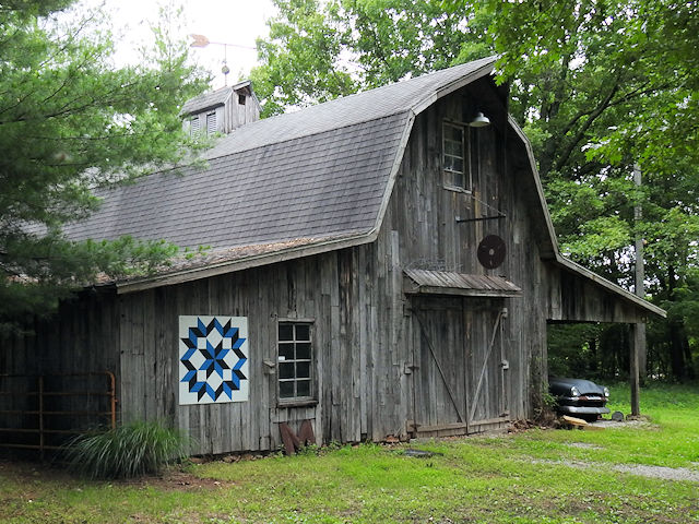 | (Dutch Rose, MO-49-36) E. of Oronogo, Mineral Township, Jasper County, MO. Ivy Rd. E. 2.9 miles from jct with Nevada St. on the S. side of Oronogo, S. on CR197 0.35 miles to the quilt on the E. side of the road at 8726 up a driveway 0.1 miles. Ask permission. McCombs Family. (N37 10.711 W94 24.786) Photos by Jack & June Schmidt 6-13-25. |