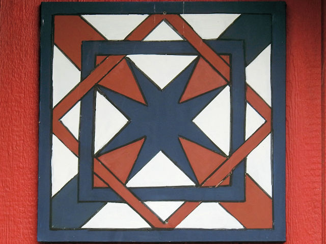 | (Untitled, MO-76-09) N. of Westphalia, Washington Township, Osage County, MO. US63 N. 1.3 miles from jct with Maries Av. in Westphalia to the quilt on the W. side of the road at 1343. Brian Beckman. (N38 27.356 W92 00.571) Photos by Jack & June Schmidt 7-27-24. |
