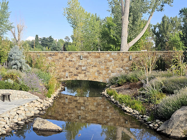 | (Wayfinder Hotel) across South Fork Bishop Creek at Wayfinder Bishop Hotel in Bishop, Inyo County, CA. On the W. side of Main St. (US6/395) 100 S. of Park St., enter hotel through entrance & park. Walk back N. about 40 N. of the entrance to the bridge. (N37 22.039 W118 23.747) Photo by Mark Comstock & Mary Groeneveld 9-20-25. |