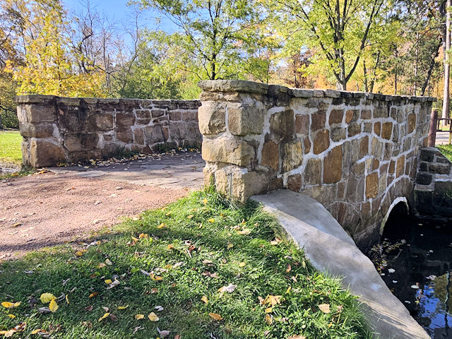 | (Iverson Park) across a stream in Iverson Park in Stevens Point, Portage County, WI. Main St. E. 100 yds from jct with Ridge Rd, S. (curves E.) into Iverson Park 0.1 miles, S. into parking lot to S. end, park & walk S. 150 yds to the bridge. (N44 31.230 W89 32.326) Photos by Mark & Clare Comstock 10-17-25. |