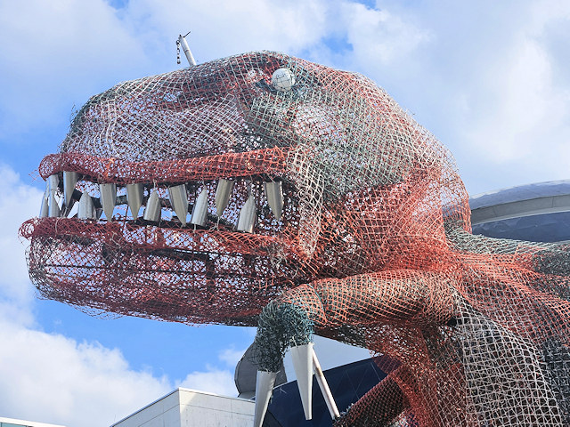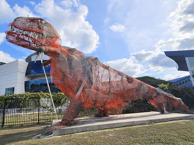 (Recyclosaurus) in Tampa, Hillsborough County, FL. FL582 (Fowler Av.) E. 3.2 miles from jct with I275 exit 51 to the statue on the S. side of the road at 4801. (N28 03.245 W82 24.329) Top 2 photos by Mark & Tim Comstock 1-8-25.