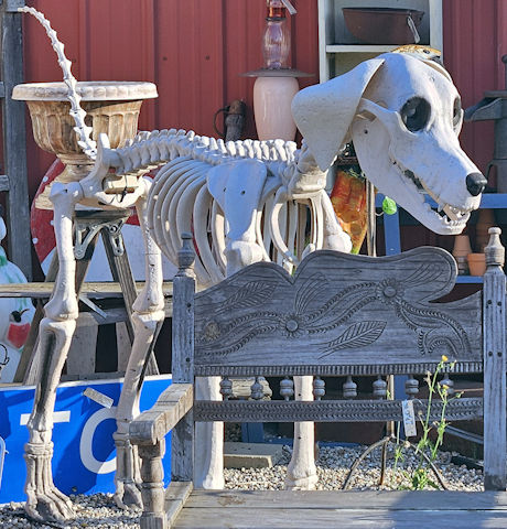 | (Skeleton) at Thrifty Treasures Antiques E. of Birch Run, Birch Run Township, Saginaw County, MI. Birch Run Rd. E. 2.0 miles from jct with I75 exit 136 on the E. side of Birch Run, N. on Gera Rd. 0.1 miles to the statue on the W. side of the road at 11970. (N43 15.087 W83 44.154) Photo by Mark Comstock 8-10-25. |