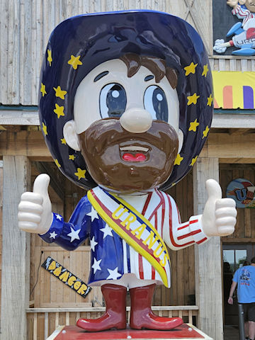 | (Cowboy #1) at Uranus Fudge Factory E. of Richmond, Wayne Township, Wayne County, IN. US40 E. 0.3 miles from jct with I70 exit 156, left to make a U turn & go back E. 0.1 miles, right & immediate left 0.1 miles, right (N.) 100 yds, left into parking lot & statue, W. most. (N39 50.102 W84 48.863) Photo by Mark Comstock & Dionis & Nevaeh Forrest 6-22-25. |