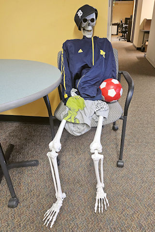| (Skeleton) in Community Education & Recreation building in Ann Arbor, Washtenaw County, MI. 7th St. S. 0.25 miles from jct with Stadium Blvd, left 110 yds, left into parking lot. Skeleton is inside 35 N. of the entrance. (N42 15.691 W83 45.385) Photo by Mark Comstock & Rick Mull 8-25-25. |