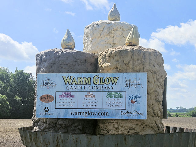 | (Candles) at Warm Glow Candle Outlet N. of Centerville, Center Township, Wayne County, IN. Centerville Rd. S. 0.1 miles from jct with US70 exit 145 N. of Centerville, E. 50 to the candle on the S. side of the road at 2131. (N39 51.446 W84 59.732) Photo by Mark Comstock & Dionis & Nevaeh Forrest 6-22-25. |