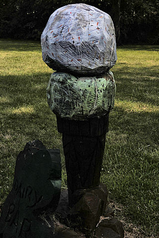 | (Ice Cream in Cone) at Irish Hills Dairy Bar SE of Brooklyn, Cambridge Township, Lenawee County, MI. MI50 S. 3.25 miles from jct with MI124 (Wamplers Lake Rd.) on the S. side of Brooklyn, E. on US12 4.05 miles to the carving on the S. side of the road at 7761. (N42 03.377 W84 08.607) Photo by Mark Comstock 8-2-25. |