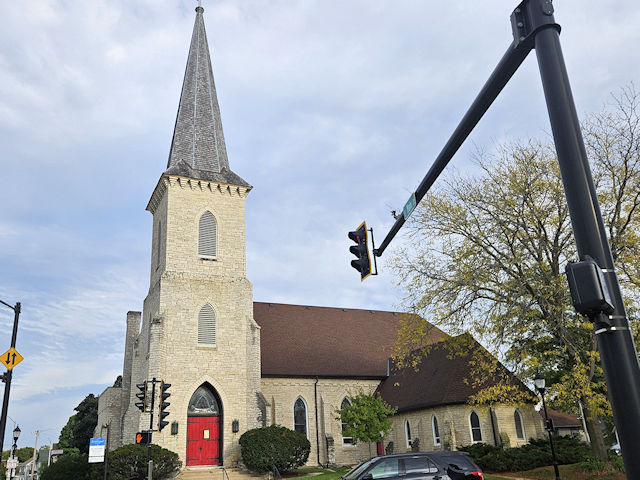 , Waukesha County, WI. At the SE corner of Main St. & East Av. (N43 00.767 W88 13.570) Photo by Mark & Clare Comstock 10-17-25.