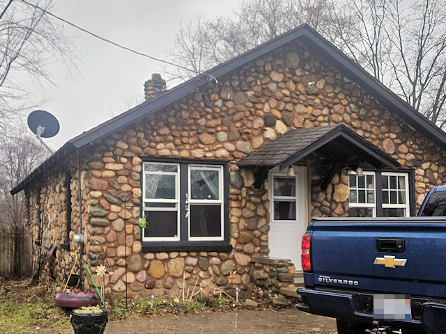 | (1923, Stone House) NW of Battle Creek, Bedford Township, Calhoun County, MI. Michigan Av. NW 0.85 miles from jct with Bedford Rd. (MI37) on the NW side of Battle Creek to the house on the SW side of the road at 3767. (N42 21.626 W85 16.922) Photo by Mark Comstock 12-28-25. |