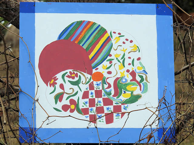 | (Grandmas Quilt Collage, AR-17-08) S. of Mountainburg, Mountainburg Township, Crawford County, AR. US71 S. 2.0 miles from jct with AR282 in Mountainburg, E. (curves NE) 1.0 miles to the quilt on the NW side of the road at 11815. Eloise Jackson. (N35 36.506 W94 09.885) Photos by Jack & June Schmidt 9-21-21. |