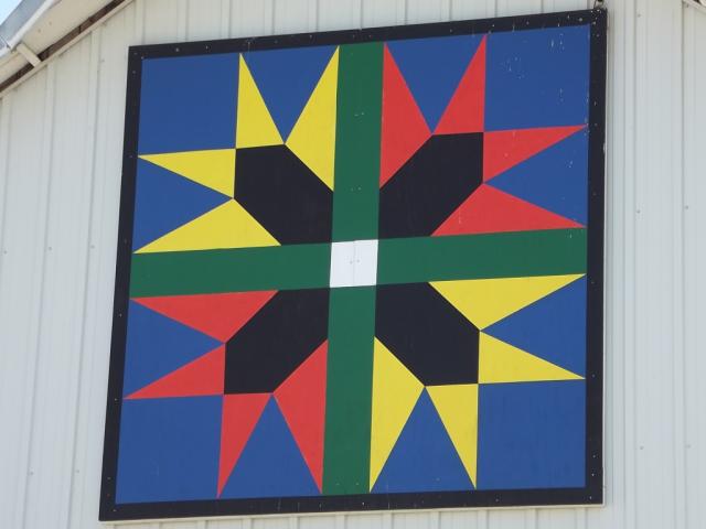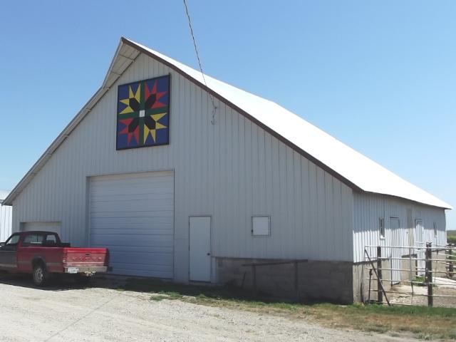 | (Birds in a Square, IA-81-51) SSW of Lytton, Coon Valley Township, Sac County, IA. Dakota Av. S. 4.7 miles from jct with US20 in Lytton, W. on 300th St. 2.3 miles to the quilt on the N. side of the road at 3473. Laverne & Colleen Arndt. (N42 21.291 W94 54.148) Photos by Jack & June Schmidt 7-16-12. |