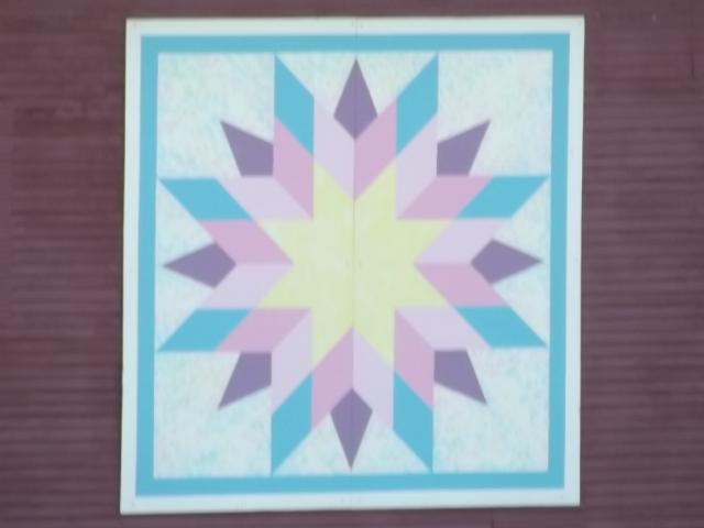 | (Kellys Star, IL-07-75) W. of Hardin, Gilead Township, Calhoun County, IL. Main St. (becomes Rocky Hill Rd., becomes Kintown Hollow Rd.) W. 3.0 miles from jct with Park St. in Hardin to the quilt on the S. side of the road. Joann Corbett. (N39 08.564 W90 39.911) Photos by Jack & June Schmidt 9-18-14. |