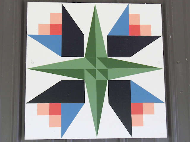| (Untitled, KS-75-40) S. of Olsburg, Blue Valley Township, Pottawatomie County, KS. KS16 W. 0.5 miles from jct with 1st St. on the S. side of Olsburg, S. on Booth Creek Rd. 1.35 miles to the quilt on the E. side of the road at 15355. Rick & Irene Johnson. (N39 24.525 W96 37.527) Photos by Jack & June Schmidt 5-20-22. |