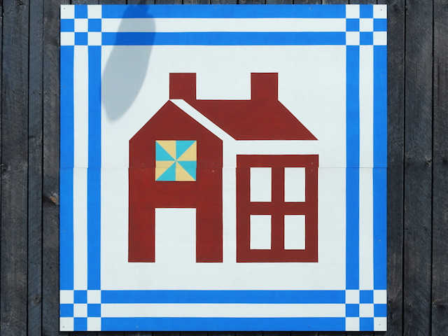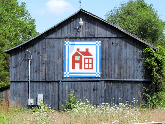 | (House Block, KY-15-10) E. of Shepherdsville, Bullitt County, KY. KY44 E. 4.7 miles from jct with I65 exit 117 in Shepherdsville to the quilt on the N. side of the road at 5464. Ruth Sohm. (N38 01.351 W85 37.709) Photos by Jack & June Schmidt 7-15-16. |