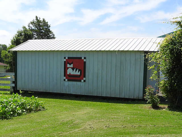 | (Cat Block, KY-15-11) E. of Shepherdsville, Bullitt County, KY. KY44 E. 2.75 miles from jct with I65 exit 117 in Shepherdsville to the quilt on the N. side of the road at 3535. Joe & Mary Sue Bleemel. (N38 00.609 W85 39.596) Photos by Jack & June Schmidt 7-15-16. |