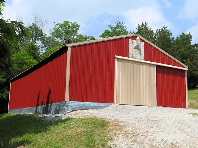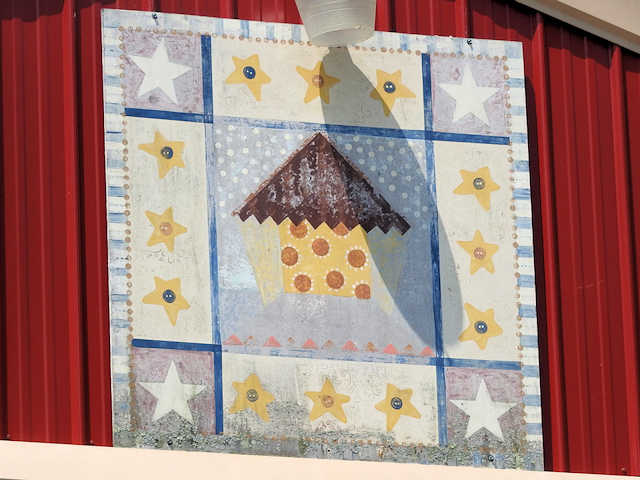 | (Sparrow, KY-37-08) W. of Stamping Ground, Franklin County, KY. KY227 (Main St. - becomes Owenton Rd.) NW 0.65 miles from jct with Woodlake Rd. in Stamping Ground, W. on Switzer Rd. 2.9 miles, sharp right & N. on Snavely Rd. 0.25 miles to the quilt on the E. side of the road at 860. Loretta Sims. (N38 16.263 W84 44.407) Photos by Jack & June Schmidt 7-1-16. |
