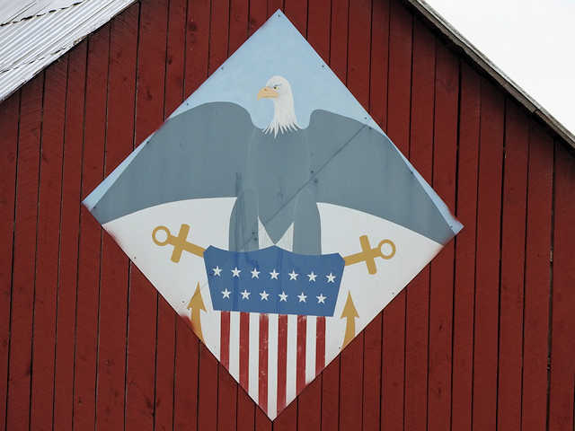 | (Eagle, KY-50-04) E. of Horse Cave, Hart County, KY. KY218 (Main St. - becomes Charlie Moran Hwy) E. 3.85 miles from jct with US31W in Horse Cave, S. on US31E 0.2 miles to the quilt on the W. side of the road at 7135. Sherman & Eleanor Vance. (N37 09.840 W85 50.481) Photos by Jack & June Schmidt 6-18-17. |