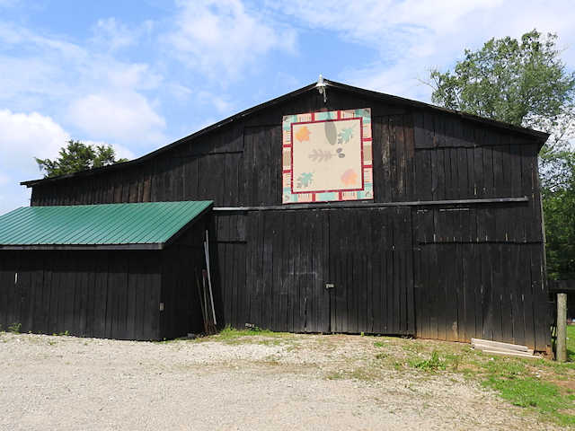 | (Amber Leaves, KY-50-14) NNE of Munfordville, Hart County, KY. I65 N. 6.3 miles from jct with US31W in Munfordville, E. on KY728 (Bacon Creek Rd.) 200, S. on Frenchman Knob Rd. 0.5 miles, E. on Locust Grove Rd. 2.45 miles, S. on James Ragland Rd. 0.1 miles to the quilt on the W. side of the road at 151. Lynn & Bettie Roberts. (N37 22.230 W85 50.990) Photos by Jack & June Schmidt 6-18-17. |