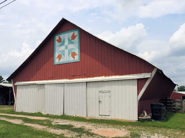 | (Goose Tracks, KY-50-18) E. of Munfordville, Hart County, KY. US31W SE (curves SW) 1.05 miles from jct with Union St. in Munfordsville, NE (curves E.) on KY88 (Hardyville Rd.) 2.0 miles to the quilt on the N. side of the road at 2050. Richard & Ann Wilkerson. (N37 16.308 W85 51.119) Photos by Jack & June Schmidt 6-18-17. |