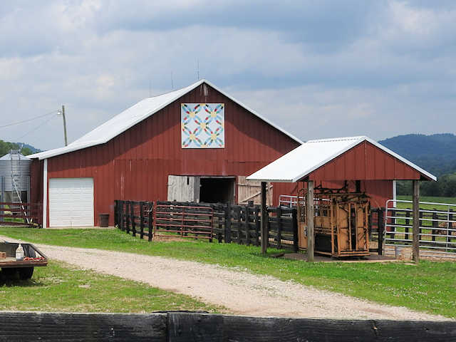 | (Double Wedding Ring, KY-50-19) E. of Munfordville, Hart County, KY. US31W SE (curves SW) 1.05 miles from jct with Union St. in Munfordsville, NE (curves E.) on KY88 (Hardyville Rd.) 3.25 miles, NE (curves E.) on KY1854 (Boyds Knob Rd.) 1.05 miles to the quilt on the N. side of the road at 1105. Bobby & Shirley Smith. (N37 16.982 W85 48.811) Photos by Jack & June Schmidt 6-18-17. |