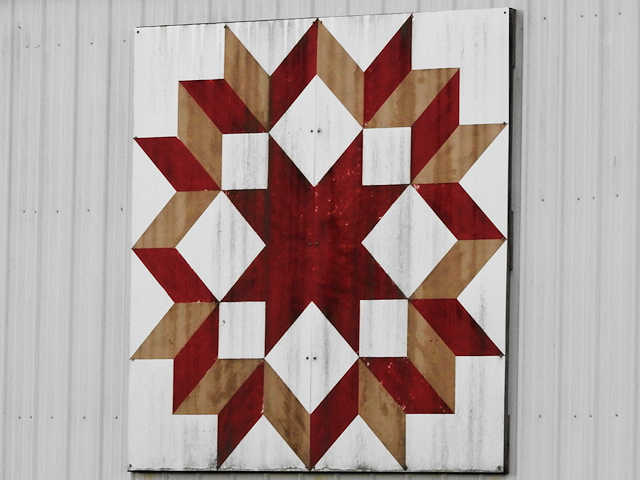 | (Carpenters Wheel, KY-50-22) SE of Munfordville, Hart County, KY. US31W SE (curves SW) 1.15 miles from jct with Union St. in Munfordsville, SE (curves S.) on KY571 (Lonoke Rd.) 2.05 miles, E. on Bunnell Crossing Rd. 4.3 miles to the quilt on the S. side of the road at 6489. CF & Martha Martin. (N37 13.352 W85 47.229) Photos by Jack & June Schmidt 6-18-17. |
