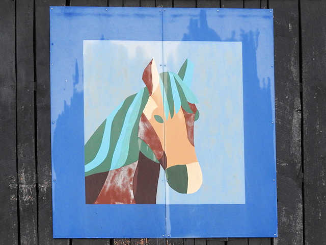 | (Horse, KY-50-27) E. of Horse Cave, Hart County, KY. KY218 (Main St. - becomes Charlie Moran Hwy) E. 3.85 miles from jct with US31W in Horse Cave, N. on US31E 0.55 miles to the quilt on the W. side of the road at 6425. Kevin & Deanna Vance. (N37 10.450 W85 50.162) Photos by Jack & June Schmidt 6-18-17. |
