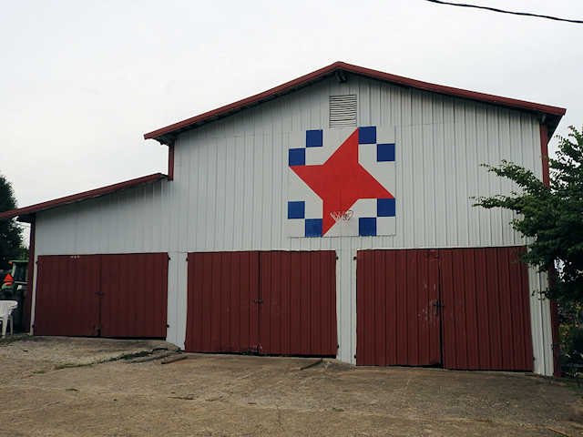 | (Texas Star, KY-50-28) NW of Cave City, Hart County, KY. Grinstead Mill (becomes Toohey Ridge) Rd. NE (curves NW) 2.9 miles from jct with KY70 (Mammoth Cave St.) in Cave City to the quilt on the NE side of the road at 1470. Vada & George Maulden. (N37 10.189 W85 59.232) Photos by Jack & June Schmidt 6-18-17. |